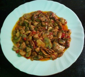 Tavuk göğsünü küçük, küçük doğrayalım.Mantarları,kırmızı biberleri,yeşil biberleri tavuğu doğradığınız büyüklükte doğrayın. Tavuğu,kızdırılmış yağın içine alın.Daha sonra ard ardına biberi, sarımsağı ve mantarı ilave edin. Malzemelerin hepsini birlikte kavurun.En son olarakta tuzunu ve karabiberini atın.